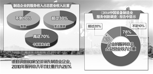 其中,有一個對企業(yè)服務(wù)型制造發(fā)展的量化指標,即示范企業(yè)服務(wù)收入占銷售收入的比重達到30%左右。對此,工信部產(chǎn)業(yè)政策司相關(guān)負責人解釋說,按照中國機械工業(yè)聯(lián)合會與德勤聯(lián)合發(fā)布的《2014中國裝備制造業(yè)服務(wù)創(chuàng)新調(diào)查》報告顯示,78%調(diào)查企業(yè)的服務(wù)收入占總營業(yè)收入比重不足10%,只有6%的調(diào)查企業(yè)占比超過20%。德勤調(diào)查了80家全球領(lǐng)先制造業(yè)企業(yè),2010年服務(wù)收入平均比重約為26%。綜合相關(guān)調(diào)研成果,《行動指南》把示范企業(yè)服務(wù)收入占比設(shè)定在30%左右是完全可行的,也充分體現(xiàn)了發(fā)展的趨勢和要求。