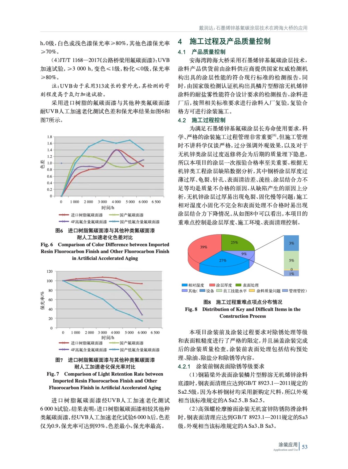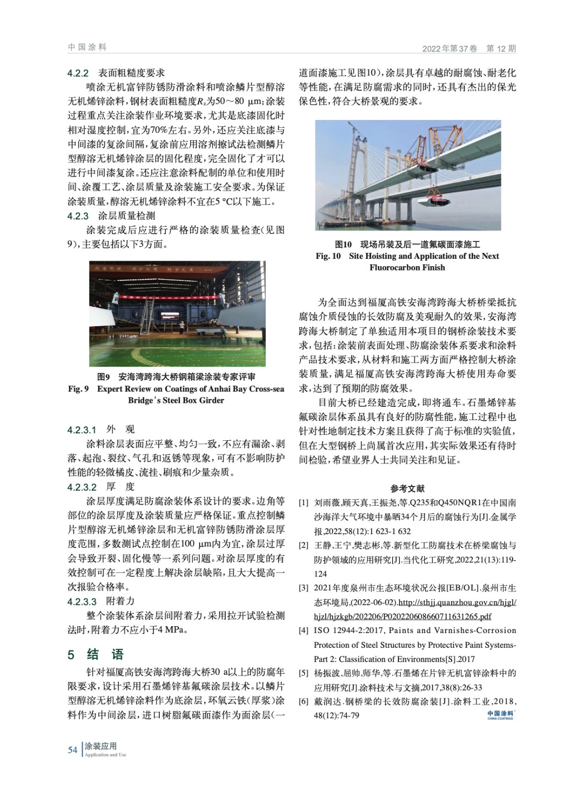 摘要:通過對福廈高鐵安海灣跨海大橋的腐蝕環境和腐蝕因素分析,結合大橋涂裝防腐壽命要求,設計了高性能石墨烯鋅基氟碳涂層技術。采用鱗片型醇溶無機烯鋅涂料作底涂層,環氧云鐵(厚漿)涂料作為中間涂層,進口樹脂氟碳面漆作為面涂層;通過耐鹽霧、與水接觸角、附著力、人工氣候老化等測試方法對涂層性能進行了評價,對福廈高鐵安海灣跨海大橋表面防腐涂層體系進行了研究;通過涂裝前表面處理、防腐涂裝體系要求和涂料產品技術要求等方面,嚴格控制大橋涂裝質量,使配套體系滿足福廈高鐵安海灣跨海大橋使用壽命要求。