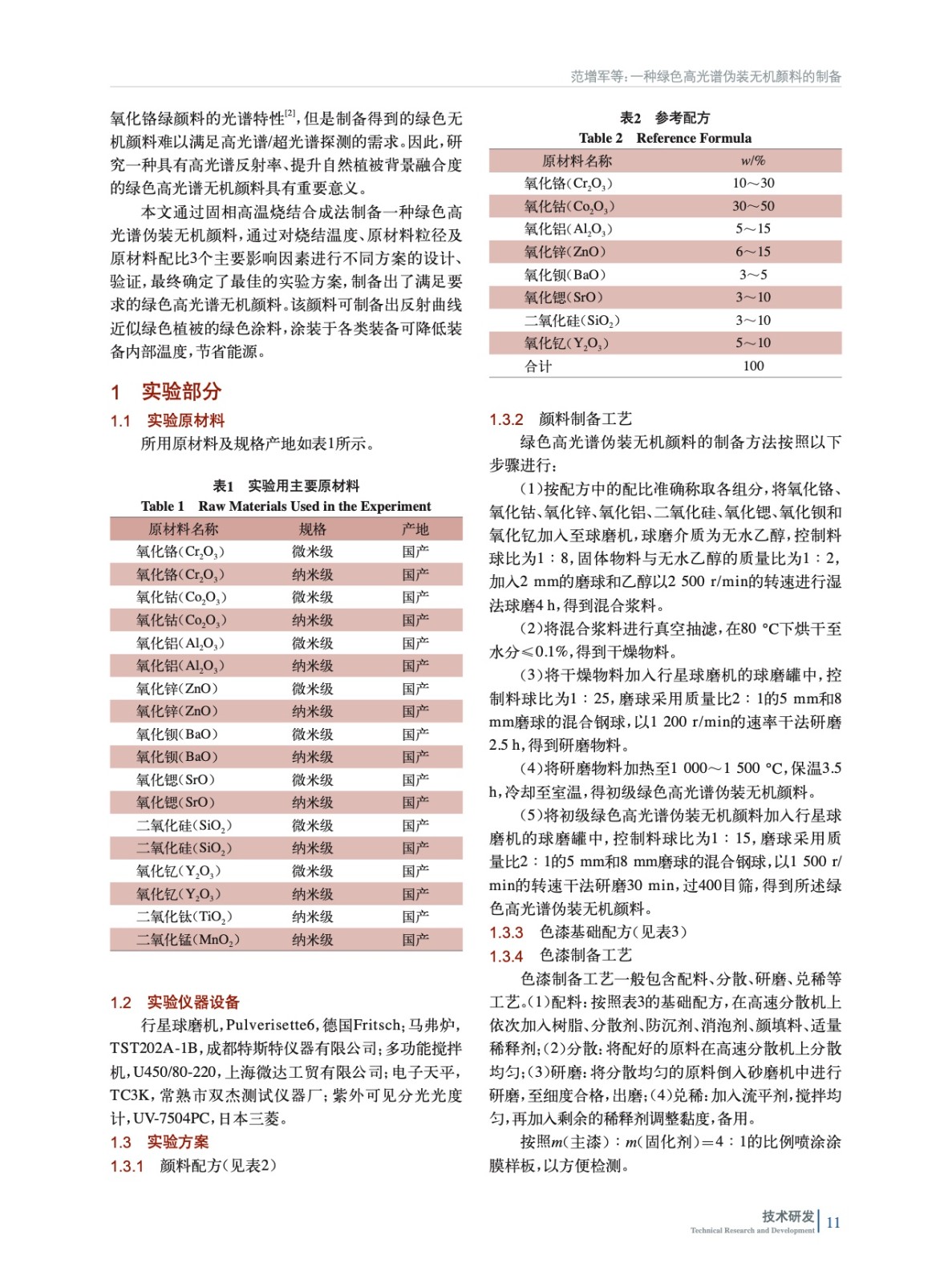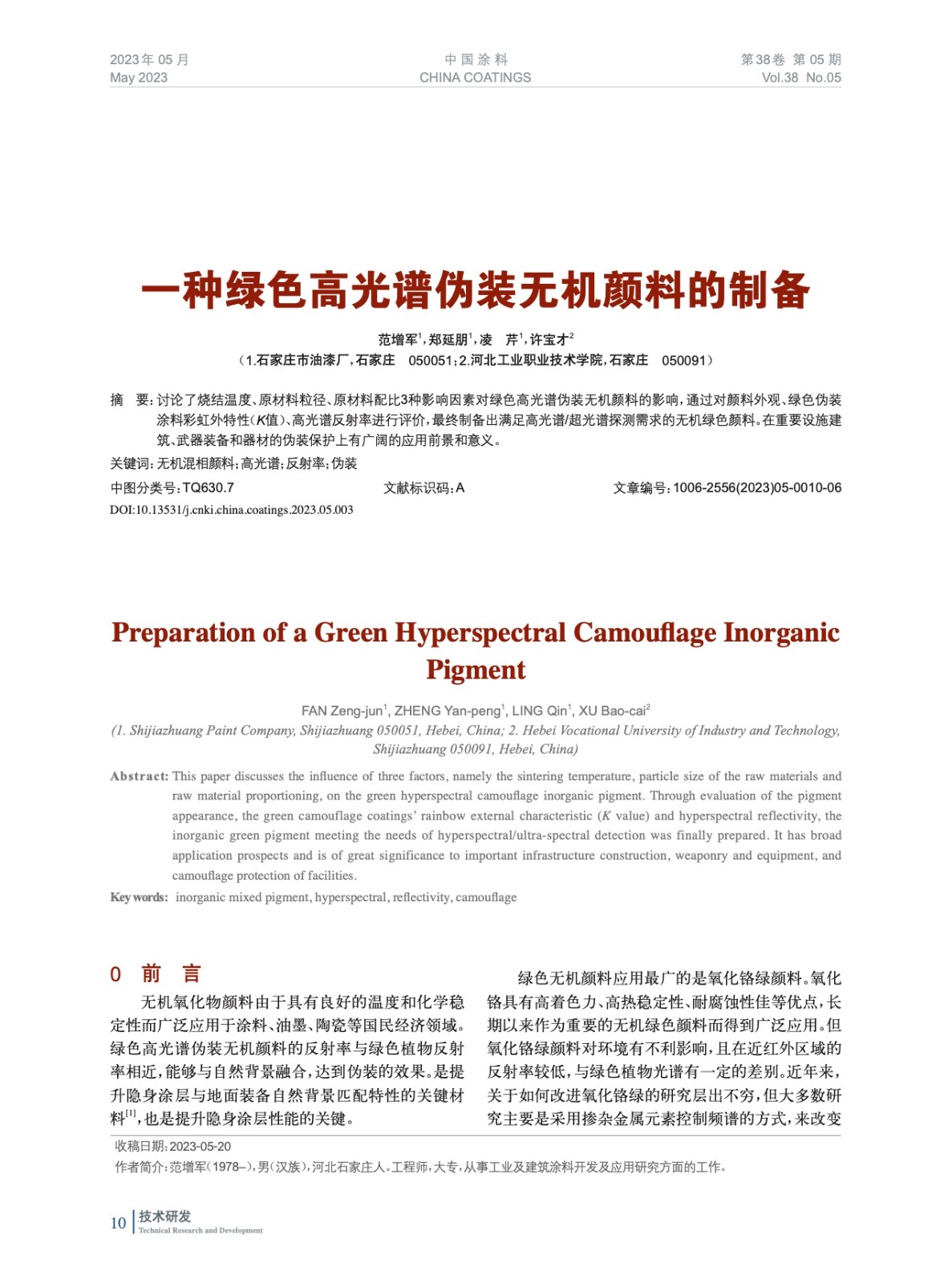 摘要:討論了燒結溫度、原材料粒徑、原材料配比3種影響因素對綠色高光譜偽裝無機顏料的影響,通過對顏料外觀、綠色偽裝涂料彩虹外特性(K值)、高光譜反射率進行評價,最終制備出滿足高光譜/超光譜探測需求的無機綠色顏料。在重要設施建筑、武器裝備和器材的偽裝保護上有廣闊的應用前景和意義。