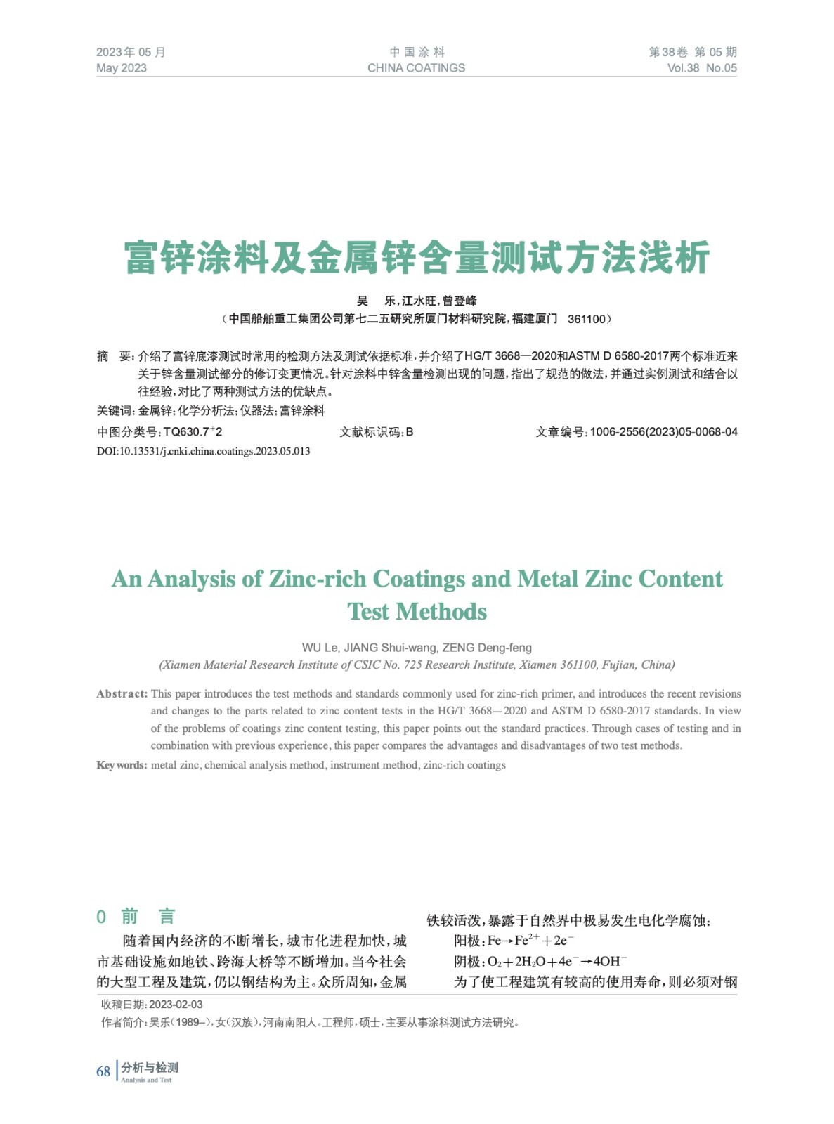 介紹了富鋅底漆測試時常用的檢測方法及測試依據標準,并介紹了HG/T 3668—2020和ASTM D 6580-2017兩個標準近來關于鋅含量測試部分的修訂變更情況。針對涂料中鋅含量檢測出現的問題,指出了規范的做法,并通過實例測試和結合以往經驗,對比了兩種測試方法的優缺點。