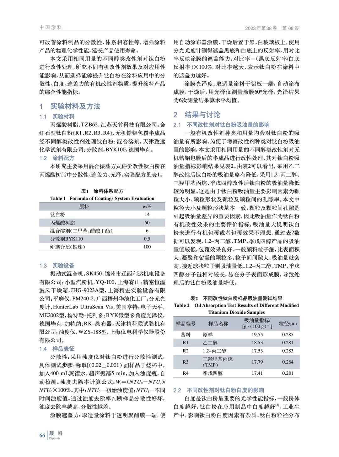 采用醇類有機劑對金紅石型鈦白粉進行有機表面改性,實驗研究不同醇類改性劑對鈦白粉改性效果。并評價改性鈦白粉在涂料體系中分散性、遮蓋力、光澤等影響。實驗結果表明:采用改性鈦白粉R3產品粉體指標、分散穩定性及涂料體系性能均較好。通過紅外光譜表征,有機改性劑在鈦白粉表面形成包覆。