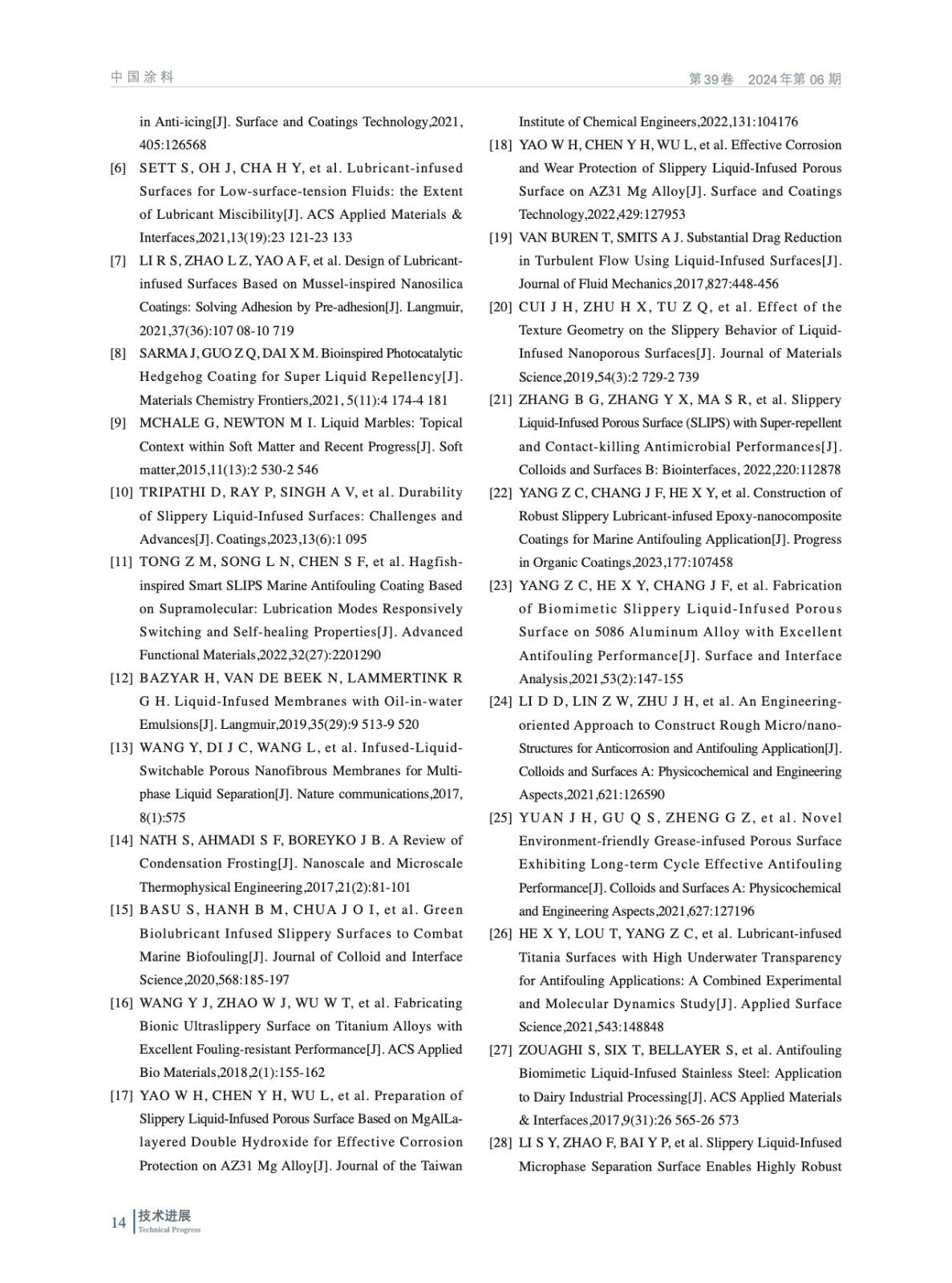 綜述了近3年來關于液體潤滑浸漬表面(SLIPS)船舶防污涂層的研究進展,特別是潤滑液的選擇與涂層的結構設計,以及這些因素如何影響涂層的整體性能,以期為未來的研究提供最新思路及研究方法。