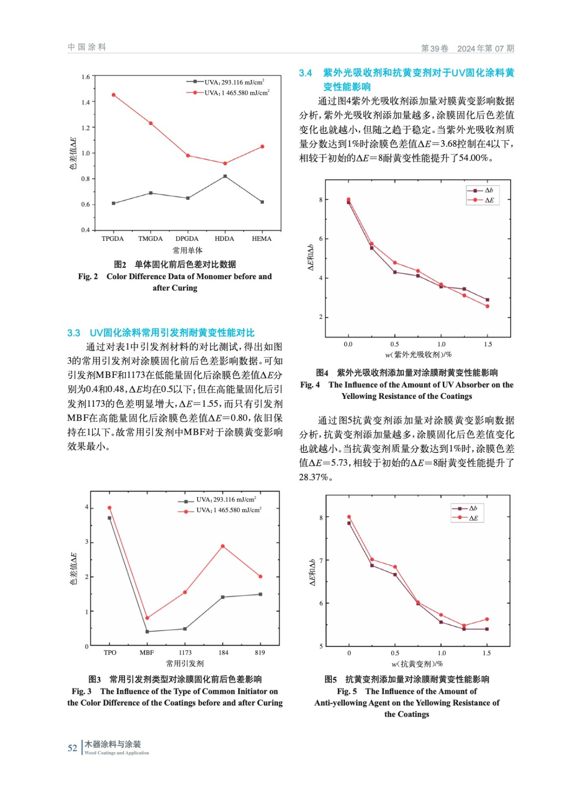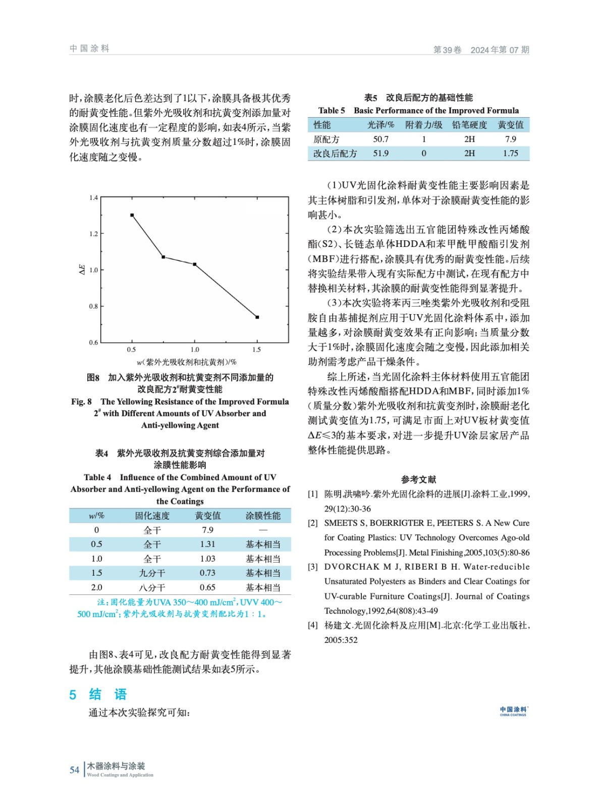 摘要:首先通過對UV光固化涂料中不同種類的主體樹脂、單體以及引發劑進行一系列搭配,制備成涂膜,再經過168 h的QUV老化測試后篩選出色差值ΔE保持在1.5以內的主體材料。其中包括改性環氧丙烯酸樹脂,以及單體HDDA、引發劑MBF。同時還探究了在UV光固化涂料中添加紫外光吸收劑和抗黃變劑對涂膜耐黃變性及其他物化性能的影響。實驗結果初步表明:當紫外光吸收劑和抗黃變劑質量分數達到1%以上時,涂膜耐黃變性能提升顯著。通過一系列搭配測試,最終得到耐黃變性能優異的紫外光固化涂料,其經過168 h耐老化測試后,ΔE小于1,從而為耐黃變UV涂料產品的制備提供了實現路徑。