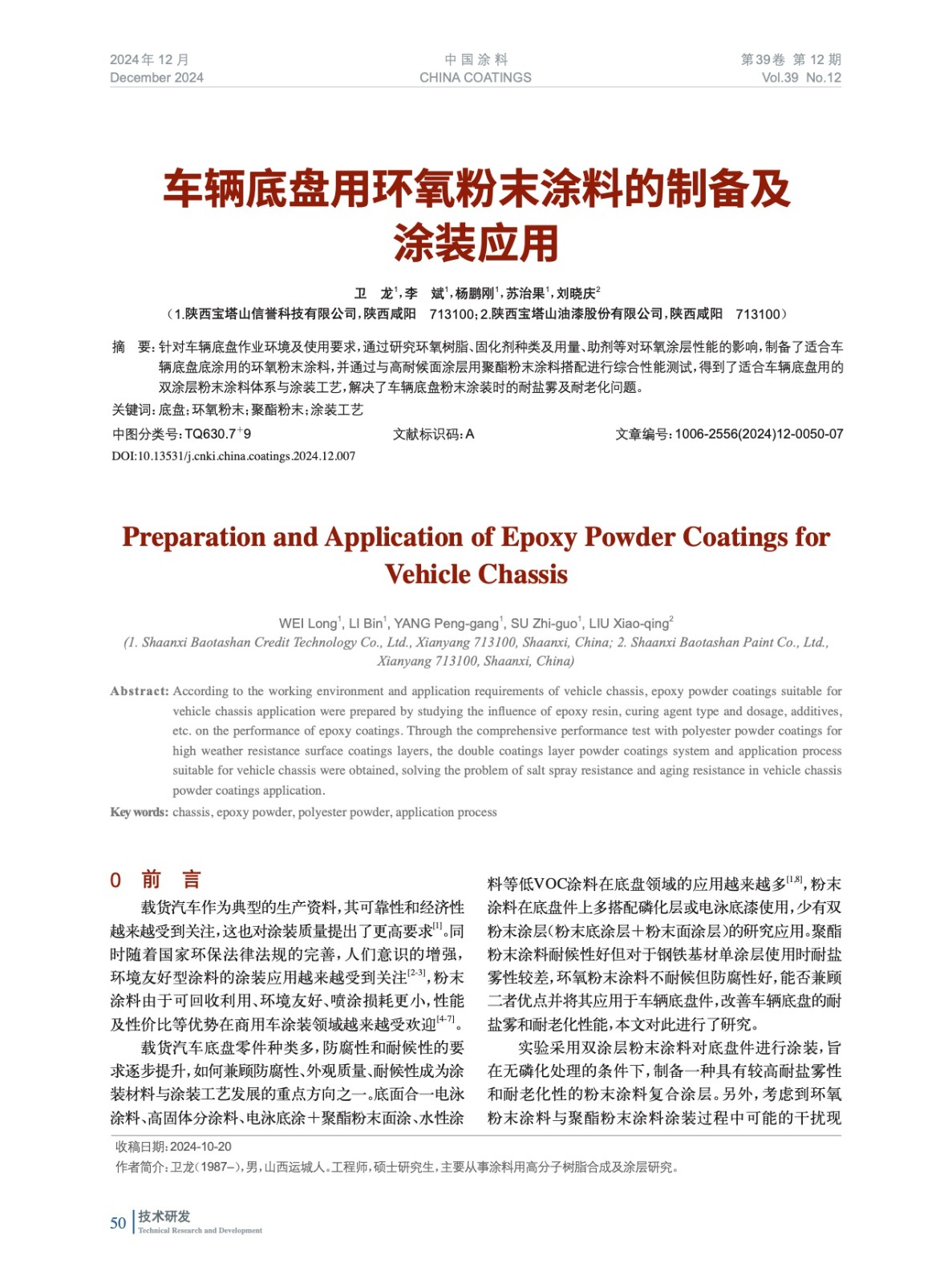 摘要:針對車輛底盤作業環境及使用要求,通過研究環氧樹脂、固化劑種類及用量、助劑等對環氧涂層性能的影響,制備了適合車輛底盤底涂用的環氧粉末涂料,并通過與高耐候面涂層用聚酯粉末涂料搭配進行綜合性能測試,得到了適合車輛底盤用的雙涂層粉末涂料體系與涂裝工藝,解決了車輛底盤粉末涂裝時的耐鹽霧及耐老化問題。