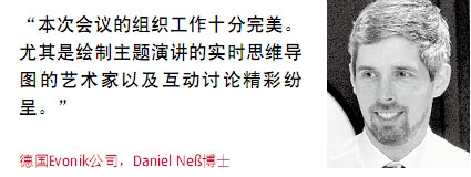 通常,各種技術會議都因循守舊,枯燥乏味。然而,歐洲涂料對話未來的會議上,涂料行業技術大咖發言幽默輕松,精彩紛呈,在茶歇期間分享技術論文,輕松進行社交活動。同時,與會者也頗受這種未來氛圍的感染,甚至在麥克風上也大做文章:將其埋置在一個較大的橡皮墊骰子中,可以在聽眾之間前后滾動。布置前衛的會議室看起來像科幻電影,藝術家可在卡通化思維導圖中實時捕捉報告精髓,創造出前所未有的行業會議氛圍。