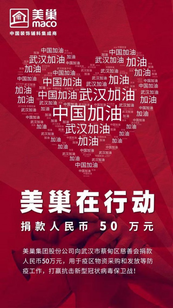 2月2日消息,美巢集團股份公司向武漢市蔡甸區慈善會捐款人民幣50萬元,用于疫區物資采購和發放等防疫工作,打贏抗擊新型冠狀病毒保衛戰!