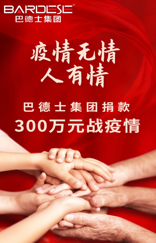 當前,疫情防控正處于關鍵時期!沐浴民族精神與光輝而成長壯大的巴德士集團時刻心系疫情。2月1日,巴德士集團率7大全資子公司聯動獻愛心:廣東巴德士、廣東花王、上海巴德士、山東巴德士、成都巴德士、江西巴德士、贛州博士家居共同捐贈300萬元戰疫情,捐款已分別匯入廣東中山、廣東開平、上海金山、山東章丘、四川大邑、江西贛州、江西南康7地紅十字會,為疫情防控送去一份力所能及的支援,為頑強與病毒抗爭的疫區兄弟姐妹們送去一份鼓舞,向祖國盡一份民族企業的責任與擔當。