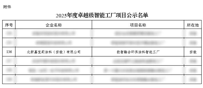 近日,工信部正式公示了2025年度卓越級(jí)智能工廠項(xiàng)目名單。經(jīng)過(guò)多輪嚴(yán)格評(píng)審,北新嘉寶莉涂料(安徽)有限公司打造的“數(shù)智融合環(huán)保涂料智能工廠”成功入選,榮獲國(guó)家級(jí)智能制造領(lǐng)域的重要認(rèn)可,國(guó)家級(jí)名片再+1!