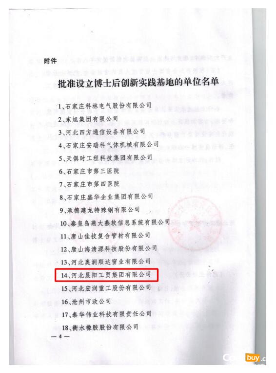 根據博士后工作總體規劃,經專家評議,河北省人力資源和社會保障廳、省博士后管理委員會研究決定,批準河北晨陽工貿集團有限公司等30個單位設立博士后創新實踐基地,開展博士后工作。