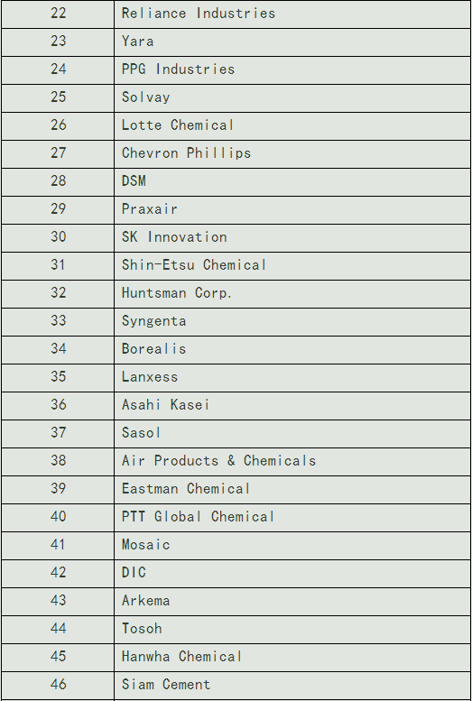 在今年的榜單中排名第二至第十的分別是陶氏化學、中石化、SABIC、埃克森美孚、臺塑、利安德巴賽爾、杜邦、英力士和拜耳。排名與去年變化不大,只有德國拜耳公司從去年的第十一名上升至今年的第十名。