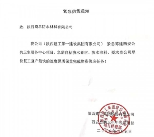 面對工期緊、任務重、人員少、物資運輸等困難,北新建材安排北新蜀羊咸陽防水材料生產基地積極應對,立即成立專項工作小組,緊急協調生產、倉儲、物流等資源,經過連夜溝通與各方面協調,克服重重困難,保障了這輛滿載防水物資的車輛在最快時間內抵達項目現場。