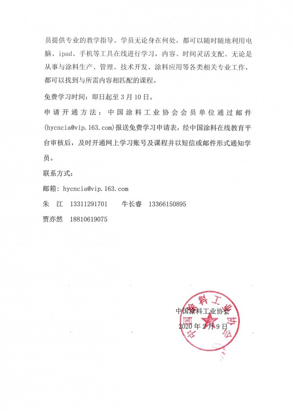 申請開通方法:中國涂料工業(yè)協(xié)會會員單位通過郵件(hycncia@vip.163.com)報送免費學(xué)習(xí)申請表,經(jīng)中國涂料在線教育平臺審核后,及時開通網(wǎng)上學(xué)習(xí)賬號及課程并以短信或郵件形式通知學(xué)員。