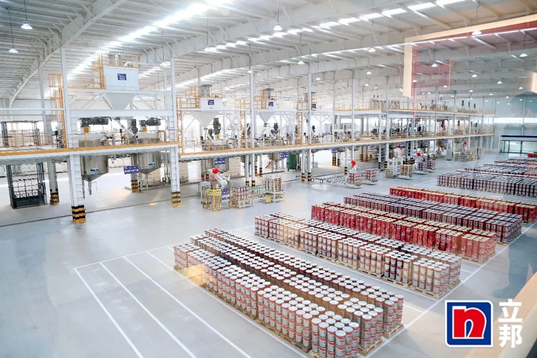 履帶上裝滿貨的環境友好型涂料桶整齊劃一地打包分裝入庫,分光儀對色卡智能分析,驅動設備精準配色,一桶桶定制環境友好型涂料不斷“誕生”。