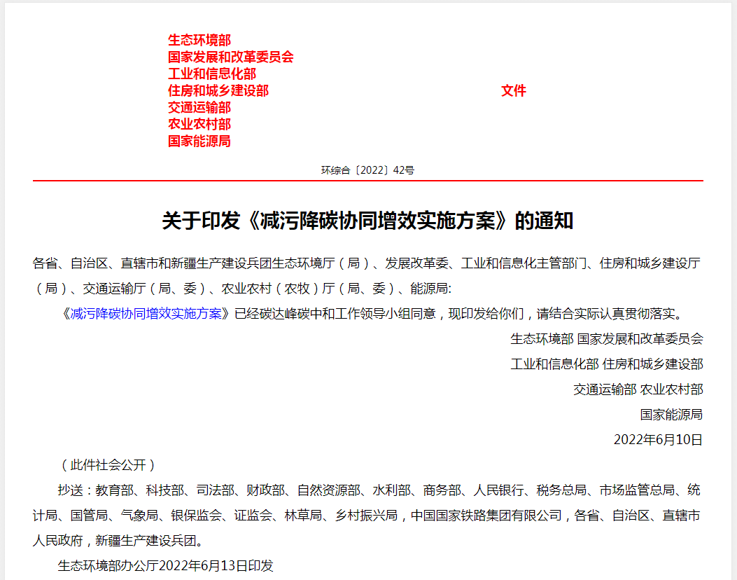 6月10日,生態環境部、發展改革委、工業和信息化部、住房城鄉建設部、交通運輸部、農業農村部、能源局聯合印發《減污降碳協同增效實施方案》