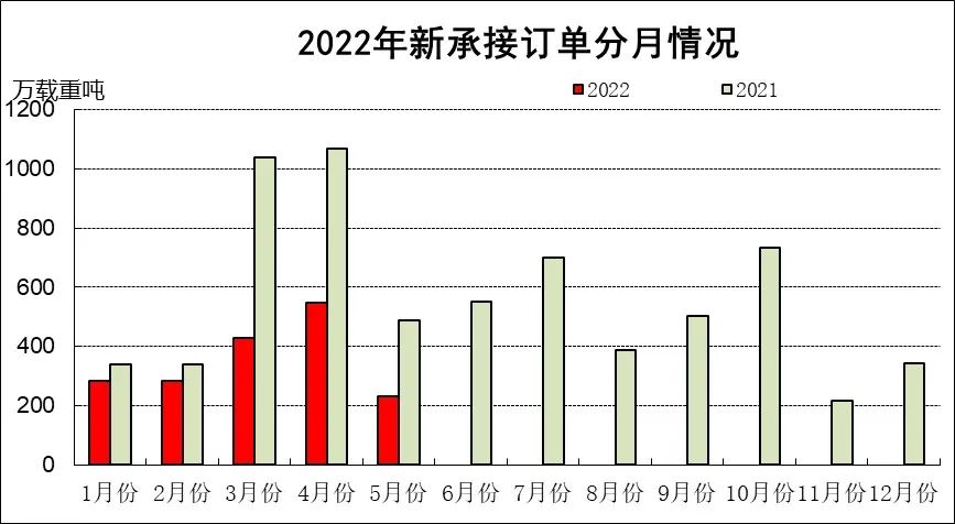 1~5月,50家重點(diǎn)監(jiān)測(cè)的造船企業(yè)完工出口船1230萬載重噸,同比下降23.4%;承接出口船訂單1546萬載重噸,同比下降46.4%;5月末手持出口船訂單8981萬載重噸,同比增長(zhǎng)21.3%。出口船舶分別占重點(diǎn)造船企業(yè)完工量、新接訂單量、手持訂單量的89.5%、93.7%和90.7%。