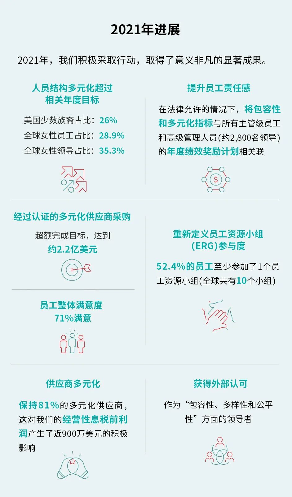 在美國少數族裔(26%)、全球女性員工(28.9%)、全球女性領導(35.3%)的占比方面均超過相關的年度提升目標。