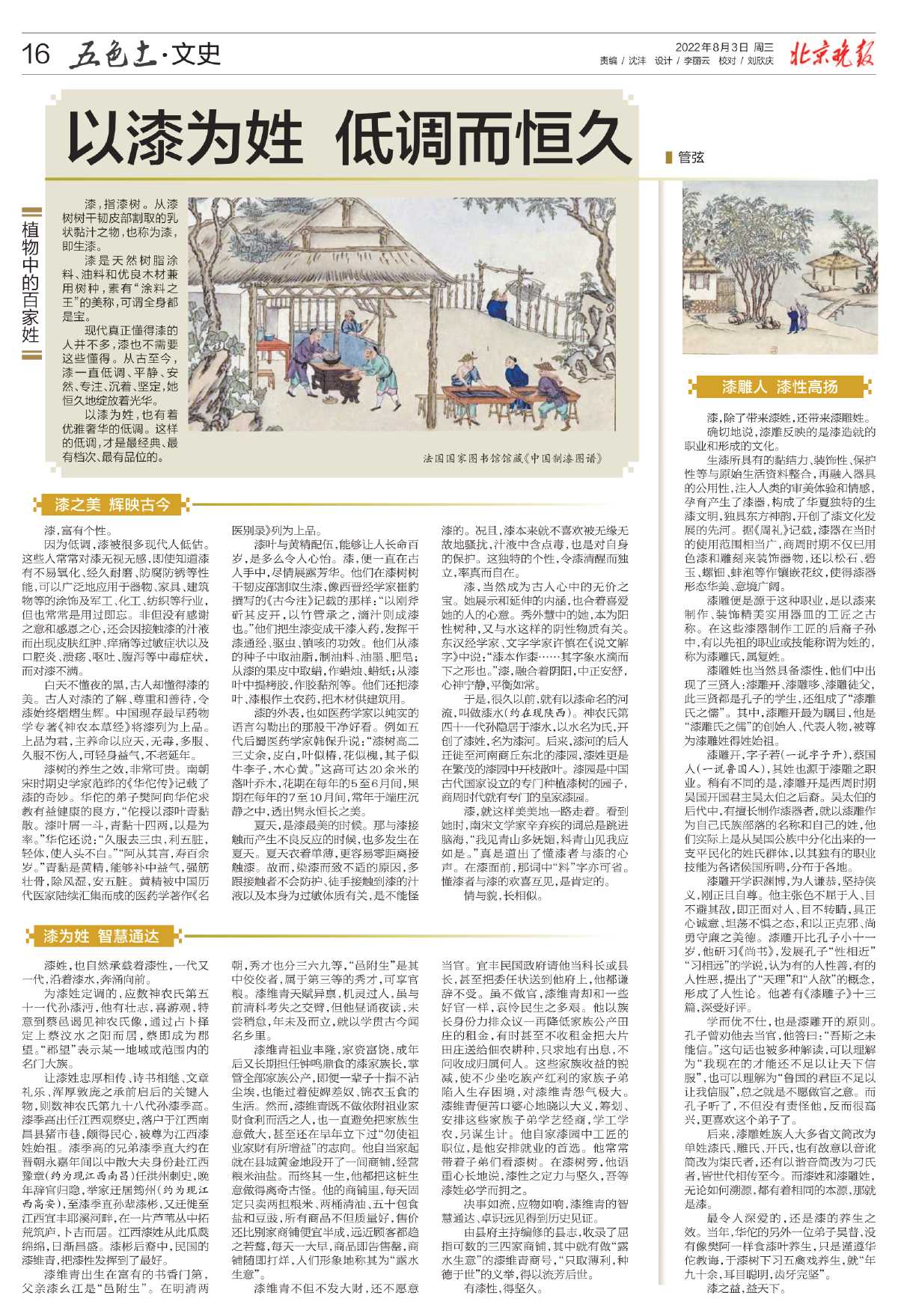 白天不懂夜的黑,古人卻懂得漆的美。古人對漆的了解、尊重和善待,令漆始終熠熠生輝。中國現存最早藥物學專著《神農本草經》將漆列為上品。上品為君,主養命以應天,無毒,多服、久服不傷人,可輕身益氣,不老延年。
