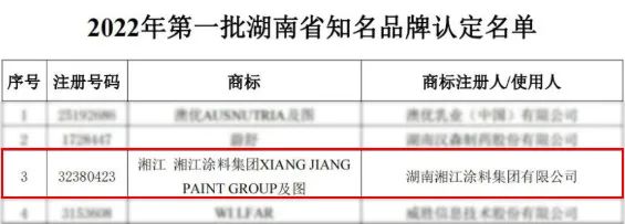 近日,湖南省商標品牌協(xié)會發(fā)布2022年第一批湖南省知名品牌認定名單,湘江涂料集團憑借強勁品牌實力第一批入選。