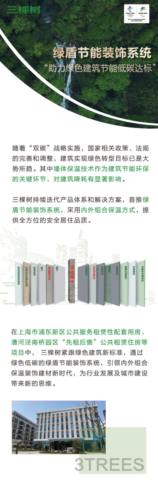 為確保工程質量安全,推動建筑節能減排,三棵樹創新研發綠盾節能裝飾系統,由建筑外墻隔熱功能涂層和內墻保溫構造組成的建筑節能裝飾系統,代替復雜厚重的保溫結構,應用于上海市浦東新區公共服務租賃性配套用房、漕河涇南橋園區“先租后售”公共租賃住房項目等項目。