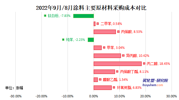 原材料行情的筑底回升與四季度涂料銷售淡季相互對沖,并沒有對涂料原材料采購造成明顯的影響,企業依舊選擇以銷定產,以產定采的模式。從部分工業涂料的客戶調研中,發現企業已經在8月份對聚氨酯固化劑 —TDI此類處于價格低位的產品提前進行擴充庫存的儲備,因此9月產品開始提價,但市場采購氛圍并不活躍。
