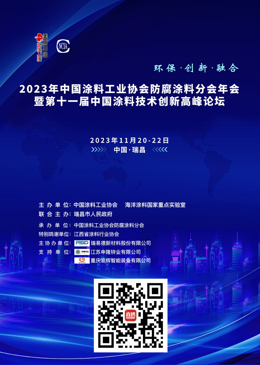 11月20-22日,由中國涂料工業(yè)協(xié)會、海洋涂料國家重點實驗室聯(lián)合瑞昌市人民政府主辦的“2023年中國涂料工業(yè)協(xié)會防腐涂料分會年會暨第十一屆中國涂料技術(shù)創(chuàng)新高峰論壇”,在素有“文化之邦”、“江南明珠”、“青銅故里”之稱的瑞昌隆重舉行。此次會議是中國防腐涂料行業(yè)的一樁盛事,也是深入學(xué)習(xí)貫徹習(xí)近平總書記考察江西親臨九江重要講話精神的生動實踐。