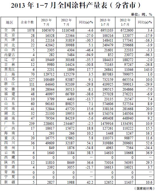 2013 年1-7 月全國涂料產量表(分省市)