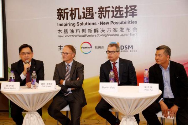 (左起)科思創(chuàng)涂料、粘合劑及特殊化學(xué)品業(yè)務(wù)部亞太區(qū)高級副總裁鐘小斌,科思創(chuàng)涂料、粘合劑及特殊化學(xué)品業(yè)務(wù)部應(yīng)用與技術(shù)開發(fā)主管彼得·克魯帕,帝斯曼涂料樹脂特種樹脂業(yè)務(wù)部全球商務(wù)總監(jiān)Martin Vlak,和帝斯曼涂料樹脂亞太區(qū)商業(yè)總監(jiān)裴忠華回答媒體提問