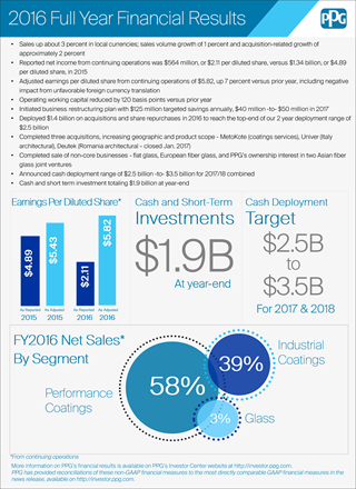 PPG公司董事長兼首席執行官MichaelH.McGarry表示:“盡管全球經濟增長緩慢,各地區表現參差不齊,再加上非常不利的匯率影響,我們第四季度和全年調整后每股攤薄收益仍然實現了穩步增長。通過提高銷量,積極的成本管控,加上多項致力于盈利增長的現金部署,公司在2016年仍然實現了業務發展的各項里程碑!